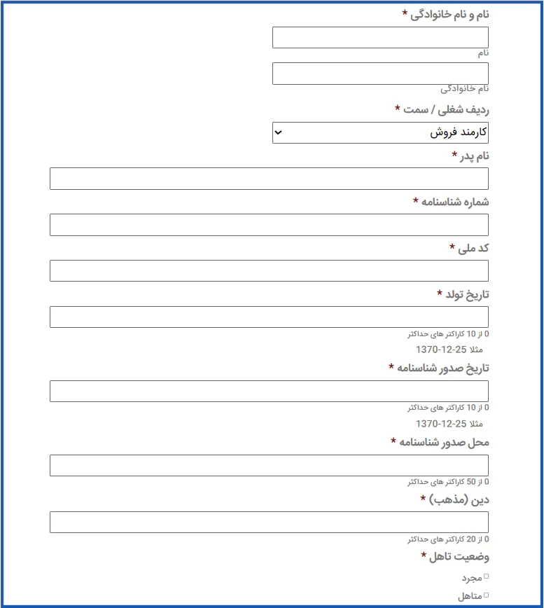 پس از کلیک روی گزینه فرصتهای شغلی، صفحهای در قالب فرم استخدام نمایش داده میشود که در مرحله نخست آن باید اطلاعات هویتی خود، از جمله نام و نام خانوادگی، ردیف شغلی مورد نظر، نام پدر و.. را وارد کرده و سپس روی دکمه "بعدی" کلیک نمایید.