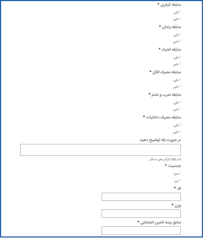 در این مرحله از فرم، باید اطلاعات مربوط به سوابق کیفری، زندان، اعتیاد و.. را با انتخاب گزینه "بله" یا "خیر" مشخص نمایید. در صورت داشتن هر یک از این سوابق، میتوانید توضیحاتی را در کادر مربوطه وارد کنید. سپس لازم است اطلاعات فردی خود شامل جنسیت، قد، وزن و سابقه بیمه تأمین اجتماعی و.. را تکمیل نمایید.