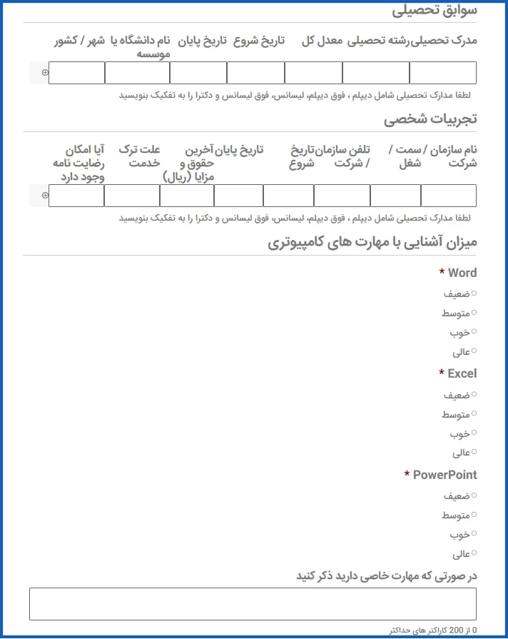این مرحله شامل اطلاعات مربوط به سوابق تحصیلی، تجربیات شغلی، میزان مهارتهای کامپیوتری و سایر توانمندیهای شما است. ابتدا میتوانید در صورت وجود، اطلاعات مربوط به سوابق تحصیلی و تجربیات شغلی خود را وارد کنید. سپس باید میزان تسلط خود بر مهارتهای کامپیوتری و زبانهای خارجی را از میان گزینههای موجود انتخاب کنید. در ادامه، در صورت داشتن سوابق آموزش تخصصی، آنها را نیز درج نمایید.