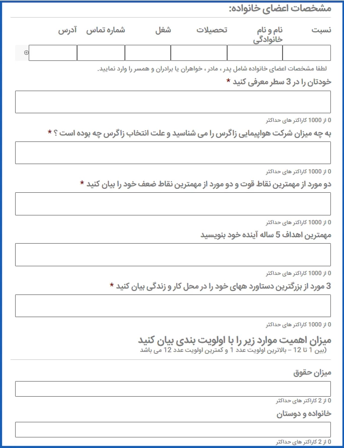 در این مرحله از فرم، میتوانید اطلاعات اعضای خانواده خود شامل نسبت، نام و نام خانوادگی، تحصیلات، شغل، شماره تماس و آدرس را وارد نمایید. سپس لازم است خود را معرفی کرده و درباره میزان آشنایی با شرکت هواپیمایی زاگرس و علت انتخاب آن توضیح دهید. همچنین باید دو مورد از مهمترین نقاط قوت و ضعف خود را بیان کرده و سایر اطلاعات خواستهشده را در فیلدهای مشخص شده وارد نمایید. توجه داشته باشید که تکمیل فیلدهایی که با ستاره مشخص شدهاند، الزامی است.