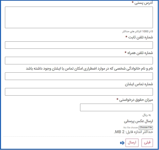 این مرحله مربوط به اطلاعات تماس و مشخصات تکمیلی شما است که در آن باید آدرس پستی، شماره تلفن ثابت، شماره تلفن همراه و.. را وارد نمایید. پس از تکمیل تمامی موارد، میتوانید تصویر پرسنلی خود را نیز بارگذاری کرده و در پایان روی دکمه "ارسال" کلیک نمایید.