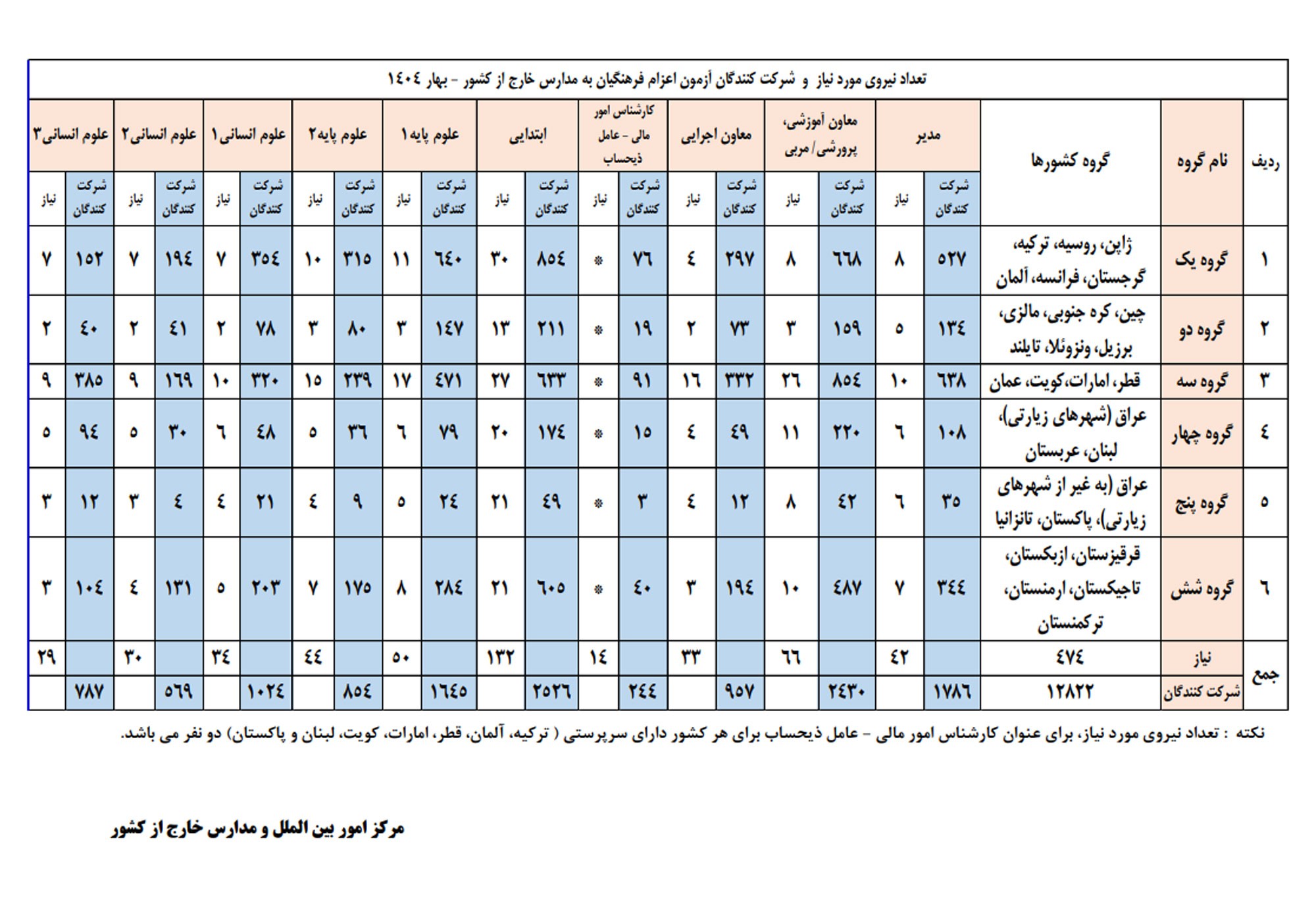 ۳ـ در انتخاب گروه کشور، توجه به شرایط اختصاصی انتخاب محل خدمت، مندرج در شیوه نامه آزمون اعزام فرهنگیان به مدارس جمهوری اسلامی ایران در خارج از کشور به شماره ۱۹۱/۱۴۰ – ۲۴ بهمن۱۴۰۳ مورد تاکید است.