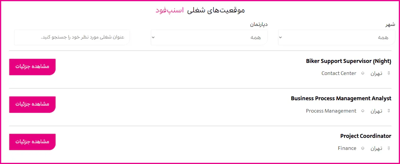 پس از ورود به صفحه فرصتهای شغلی، صفحهای مطابق تصویر زیر نمایش داده میشود که فرصتهای فعال اسنپ فود قابل مشاهده است. با استفاده از ابزارهای موجود در بالای صفحه میتوانید شهر، دپارتمان و عنوان شغلی موردنیاز خود را فیلتر کنید. سپس مطابق با شرایط خود با انتخاب گزینه مشاهده جزییات نسبت به ارسال رزومه اقدام نمایید.