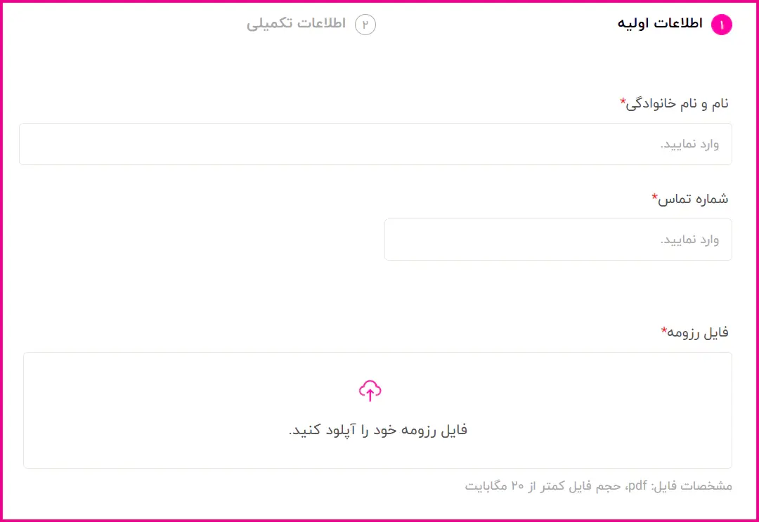 پس از انتخاب گزینه Apply، صفحهای همانند تصویر زیر در قالب فرم استخدام نمایش داده میشود که نیاز است اطلاعات احراز هویتی (نام، نام خانوادگی، شماره تماس و..) را وارد نمایید و در قسمت آخر فرم، فایل رزومه خود را آپلود کنید.
