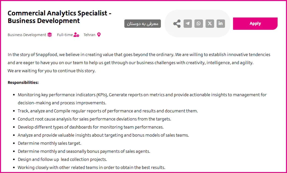 در صفحه نمایش داده شده پس از مطالعه شرایط احراز آگهی، گزینه Apply را انتخاب و فرم استخدام اسنپ فود را تکمیل نمایید.