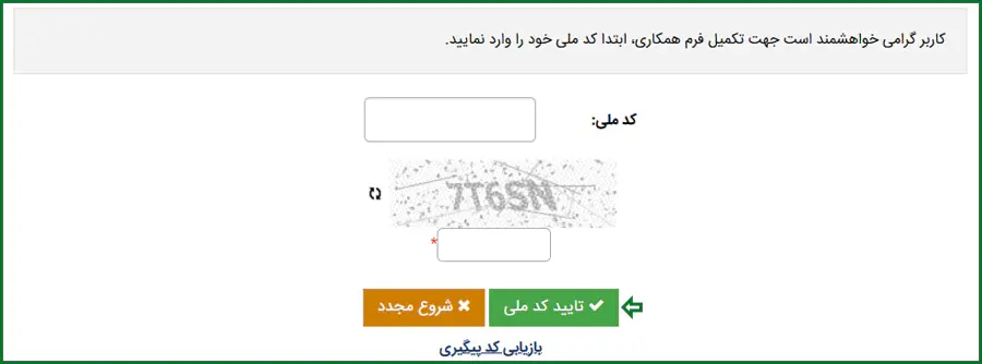 در این مرحله، کد ملی و کد امنیتی نمایش داده شده را وارد کرده و روی دکمه "تأیید کد ملی" کلیک نمایید.