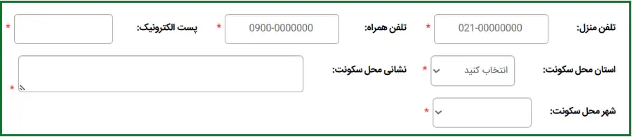 در این بخش باید اطلاعات تماس خود، شامل مواردی نظیر تلفن منزل، تلفن همراه، پست الکترونیک و.. را وارد نمایید.