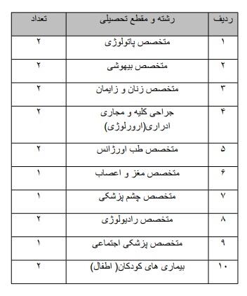 بر اساس این اطلاعیه و با استناد به نامه مورخ ۱۴۰۴/۰۵/۲۶ وزارت بهداشت، دانشگاه علوم پزشکی آبادان در سال ۱۴۰۴ با سهمیه آزاد و به منظور انجام تعهدات مقطع تخصص، در رشتههای تخصصی زیر اقدام به جذب عضو هیأت علمی میکند: