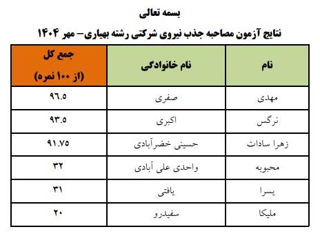 ضمن عرض سلام و آرزوی موفقیت؛ بدینوسیله به اطلاع داوطلبین محترم آزمون جذب نیروی شرکتی رشته بهیاری سال 1404 میرساند، با توجه به نمرات آزمون مصاحبه، نتایج پایانی این آزمون به قرار فایل پیوست اعلام میگردد.