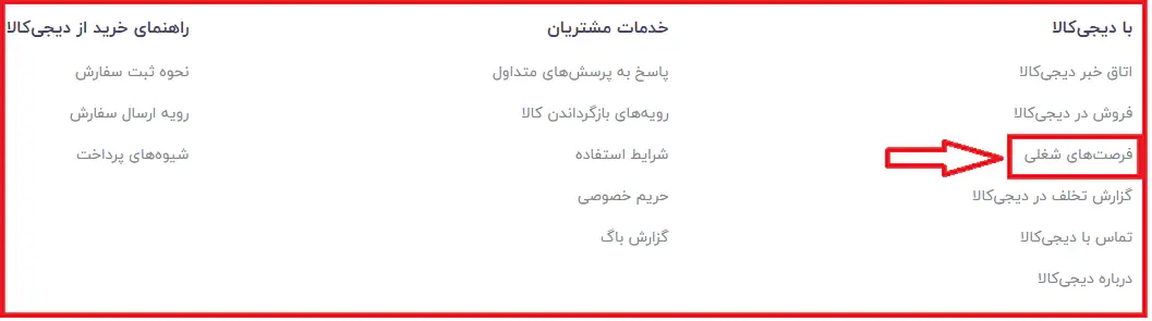 در قسمت انتهایی صفحه اول سایت دیجی کالا (فوتر صفحه اصلی)، بر روی گزینه "فرصتهای شغلی" کلیک نمایید.