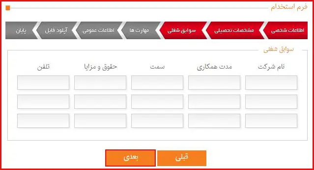 پس از وارد کردن مشخصات تحصیلی، سوابق شغلی خود را وارد کنید و سپس بر روی دکمه «بعدی» کلیک نمایید.