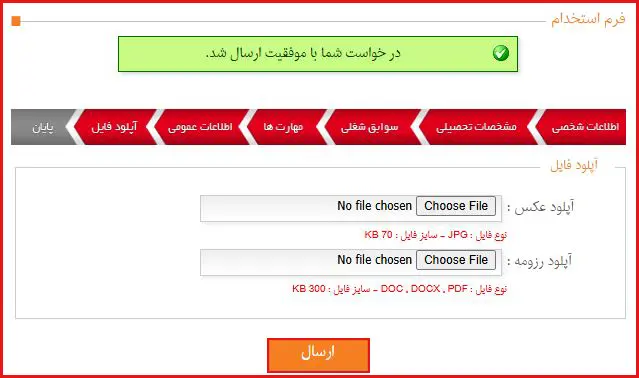 در این مرحله، عکس پرسنلی و رزومه خود را بارگذاری کرده و سپس بر روی دکمه «ارسال» کلیک نمایید.