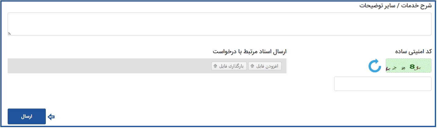 در این مرحله میتوانید جزئیات بیشتری درباره درخواست یا حوزه تخصصی خود ارائه دهید. همچنین، میتوانید اسناد مرتبط با درخواست خود را در بخشهای مربوطه بارگذاری نمایید. در انتها، لازم است کد امنیتی نمایشداده شده را وارد کرده و روی دکمه "ارسال" کلیک نمایید.