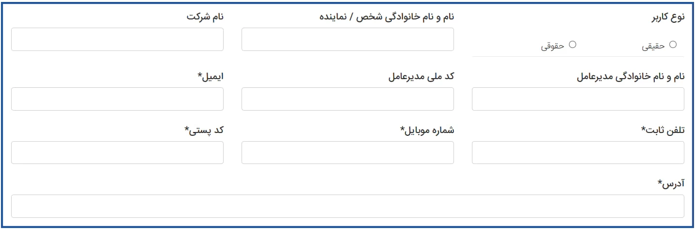 پس از کلیک روی گزینه فرصتهای همکاری، صفحهای مشابه تصویر زیر نمایش داده میشود که در آن میتوانید اطلاعات اولیه خود را بر اساس نوع کاربر (حقیقی یا حقوقی) وارد نمایید. در این بخش، میتوانید اطلاعاتی مانند نام و نام خانوادگی، آدرس، شماره موبایل و.. را ثبت کنید. توجه داشته باشید تکمیل فیلدهایی که با علامت ستاره مشخص شدهاند، الزامی است.