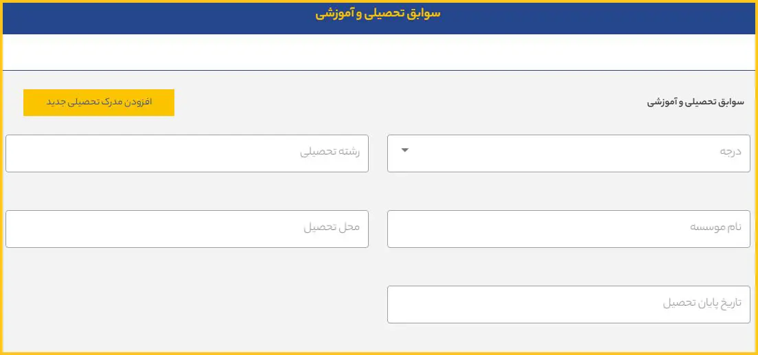 در این مرحله، اطلاعات مربوط به سوابق تحصیلی خود از جمله مقطع یا درجه تحصیلات، رشته تحصیلی، نام موسسه آموزشی و موارد مرتبط را مطابق فرم تکمیل نمایید.