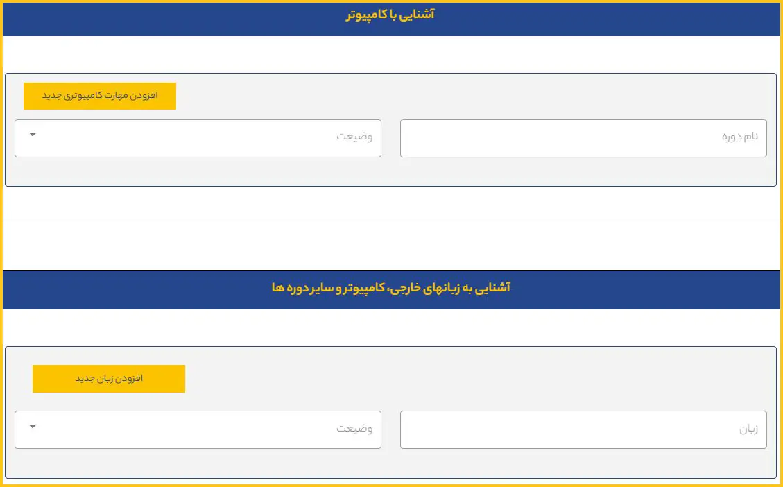 در این مرحله، در صورت آشنایی با کامپیوتر، زبانهای خارجی یا گذراندن دورههای آموزشی مرتبط، نام دورهها و سطح مهارت خود را در بخشهای مربوطه درج نمایید.