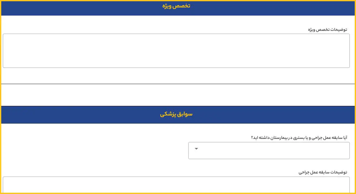 در صورت برخورداری از تخصصهای ویژه، توضیحات لازم را در کادر مربوطه وارد کنید. همچنین اطلاعات مربوط به سوابق پزشکی خود را طبق موارد خواستهشده تکمیل نمایید.