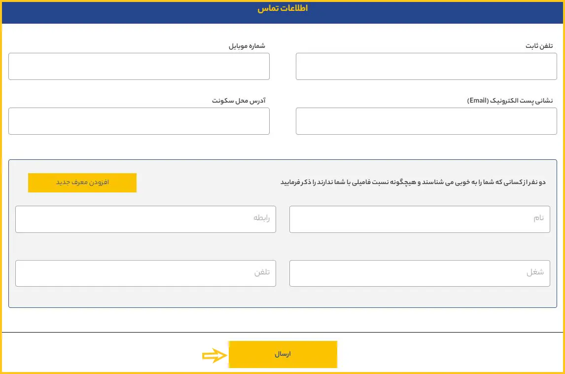 در بخش پایانی، اطلاعات تماس شامل تلفن ثابت، شماره تلفن همراه، نشانی پست الکترونیک، آدرس محل سکونت و مشخصات معرف خود را تکمیل کرده و سپس با کلیک بر روی گزینه «ارسال»، فرم استخدام را ثبت نمایید.