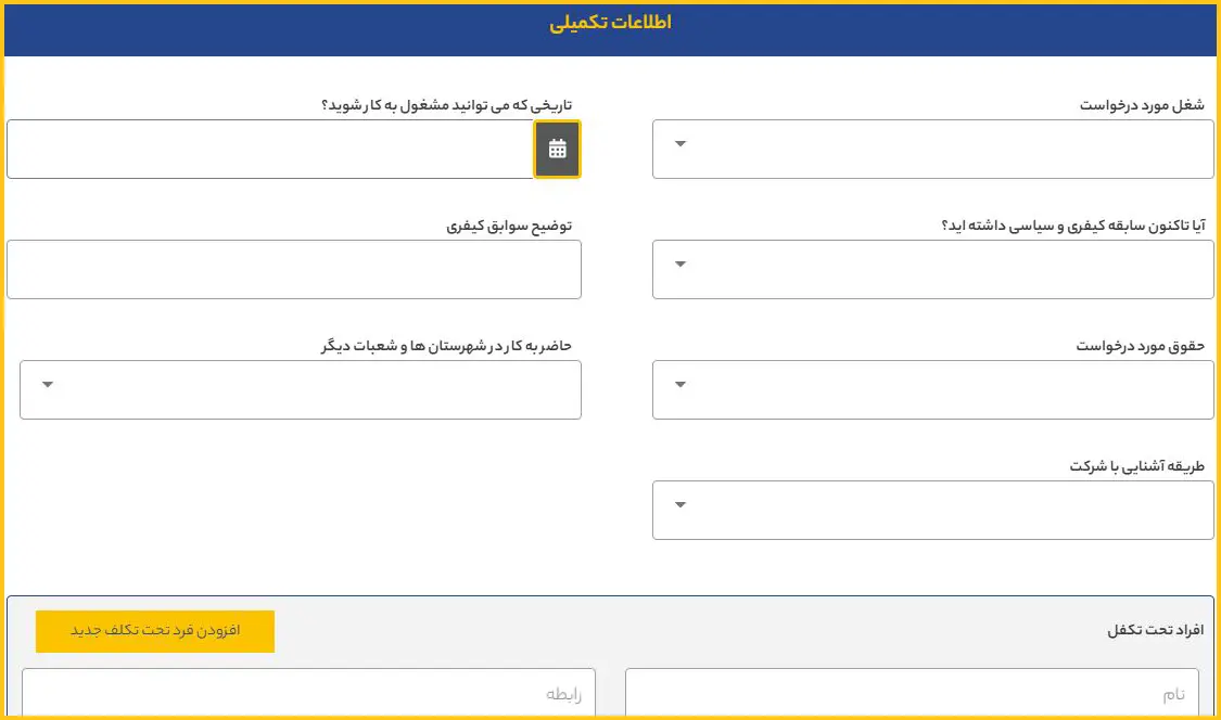 در این مرحله، اطلاعات تکمیلی نظیر شغل مورد درخواست، تاریخ پیشنهادی شروع به کار، حقوق مورد درخواست و سایر موارد مرتبط را وارد کرده و در پایان رزومه خود را بارگذاری نمایید.