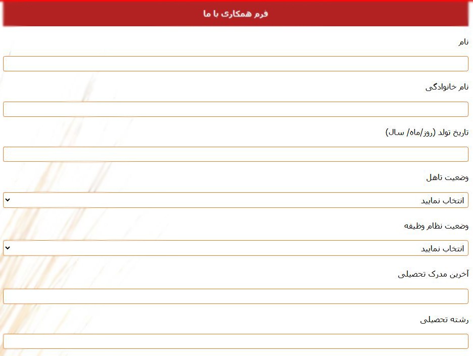 پس از کلیک بر روی گزینه "فرم استخدام" به صفحه ای هدایت میشوید که در آن باید، اطلاعات فردی خود نظیر نام و نام خانوادگی، تاریخ تولد وضعیت تأهل، آخرین مدرک تحصیلی و.. را وارد کنید.