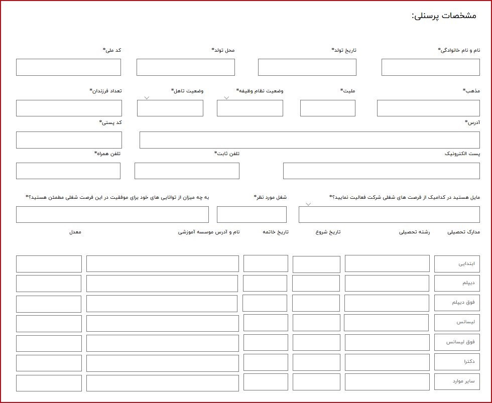 در این بخش، کارجویان باید اطلاعات شخصی خود شامل نام و نام خانوادگی، کد ملی، تاریخ تولد، محل تولد،و.. را وارد کنند. همچنین، اطلاعات مربوط به تحصیلات شامل مدرک تحصیلی، رشته تحصیلی، تاریخ شروع و پایان تحصیل، نام و آدرس موسسه آموزشی و معدل نیز باید وارد شود.