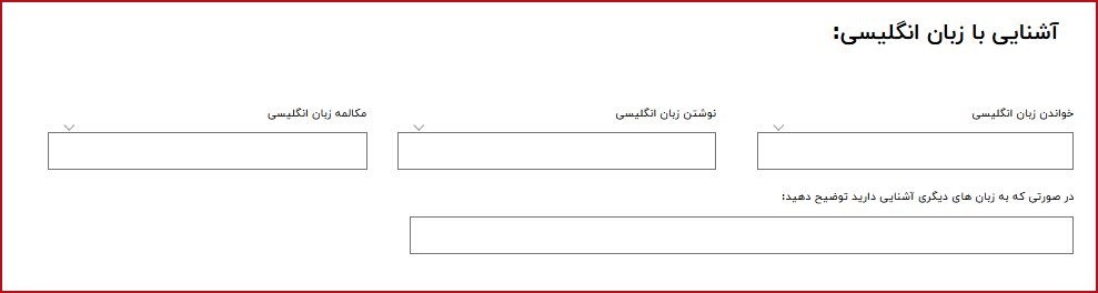 در این بخش، کارجویان باید میزان آشنایی خود با زبان انگلیسی را وارد کنند. اطلاعات مورد نیاز شامل میزان مهارت در مکالمه، نوشتن، خواندن و فهم زبان انگلیسی است. همچنین، اگر کارجو به زبانهای دیگری نیز آشنا است، میتواند آنها را در قسمت توضیحات وارد کند.