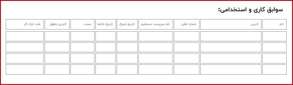 در این بخش، کارجویان باید سوابق شغلی و استخدامی خود را وارد کنند. اطلاعاتی که باید در این قسمت ذکر شوند عبارتند از: نام شغل، علت ترک کار، آخرین حقوق دریافتی، سمت، تاریخ خاتمه، تاریخ شروع، نام و آدرس کارفرما، شماره تلفن کارفرما و آدرس محل کار.