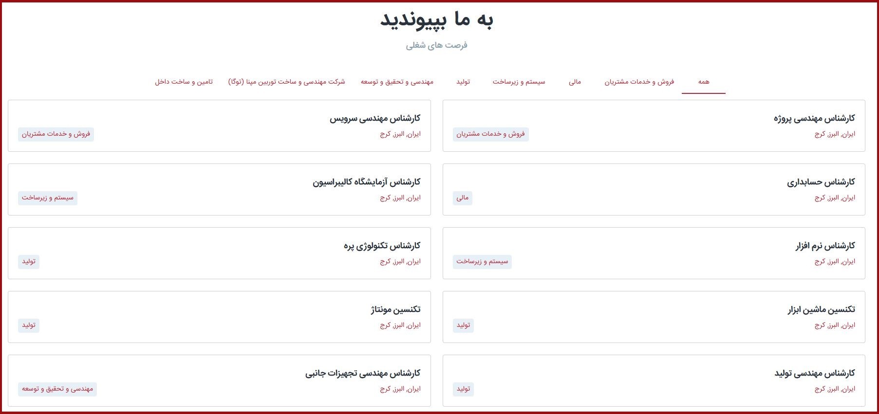 پس از ورود به صفحه فرصتهای شغلی، لیستی از موقعیتهای موجود در مپنا توگا نمایش داده میشود. این فرصتها در دستهبندیهای مختلف مانند مهندسی و تحقیق و توسعه، تولید، مالی، سیستم و زیرساخت، فروش و خدمات و.. مشتریان قرار دارند.