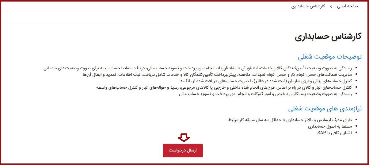 از میان موقعیتهای نمایش داده شده، شغل موردنظر خود را انتخاب کرده و روی آن کلیک نمایید تا جزئیات فرصت شغلی نمایش داده شود؛ پس از بررسی توضیحات شغل و تطابق شغل با مهارتها و تجربه کاری خود روی گزینه ارسال درخواست کلیک کنید. با کلیک روی این دکمه، به صفحه تکمیل فرم استخدام هدایت خواهید شد که در مرحله بعد توضیحات آن داده شده است.