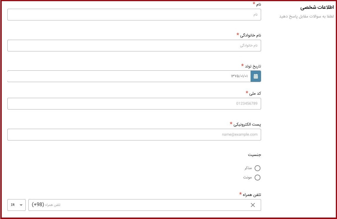 در این بخش، باید اطلاعات هویتی خود را با دقت وارد کنید. این اطلاعات شامل نام، نام خانوادگی، تاریخ تولد، کدملی، پست الکترونیکی، جنسیت و شماره تلفن همراه است. فیلدهای ستارهدار (*) اجباری هستند و باید بهدرستی تکمیل شوند.