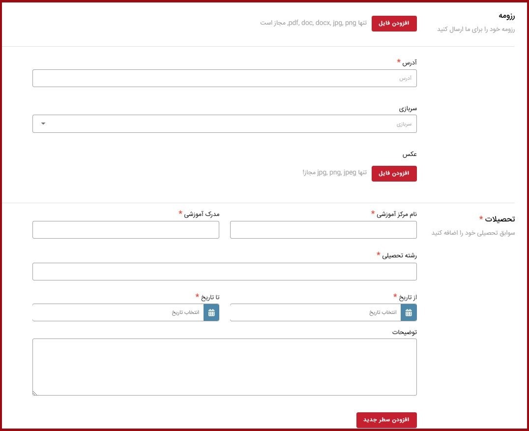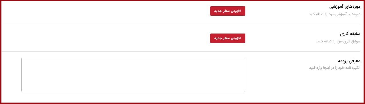در این بخش، باید اطلاعات مربوط به دورههای آموزشی، سوابق کاری و معرفی رزومه را تکمیل کنید.