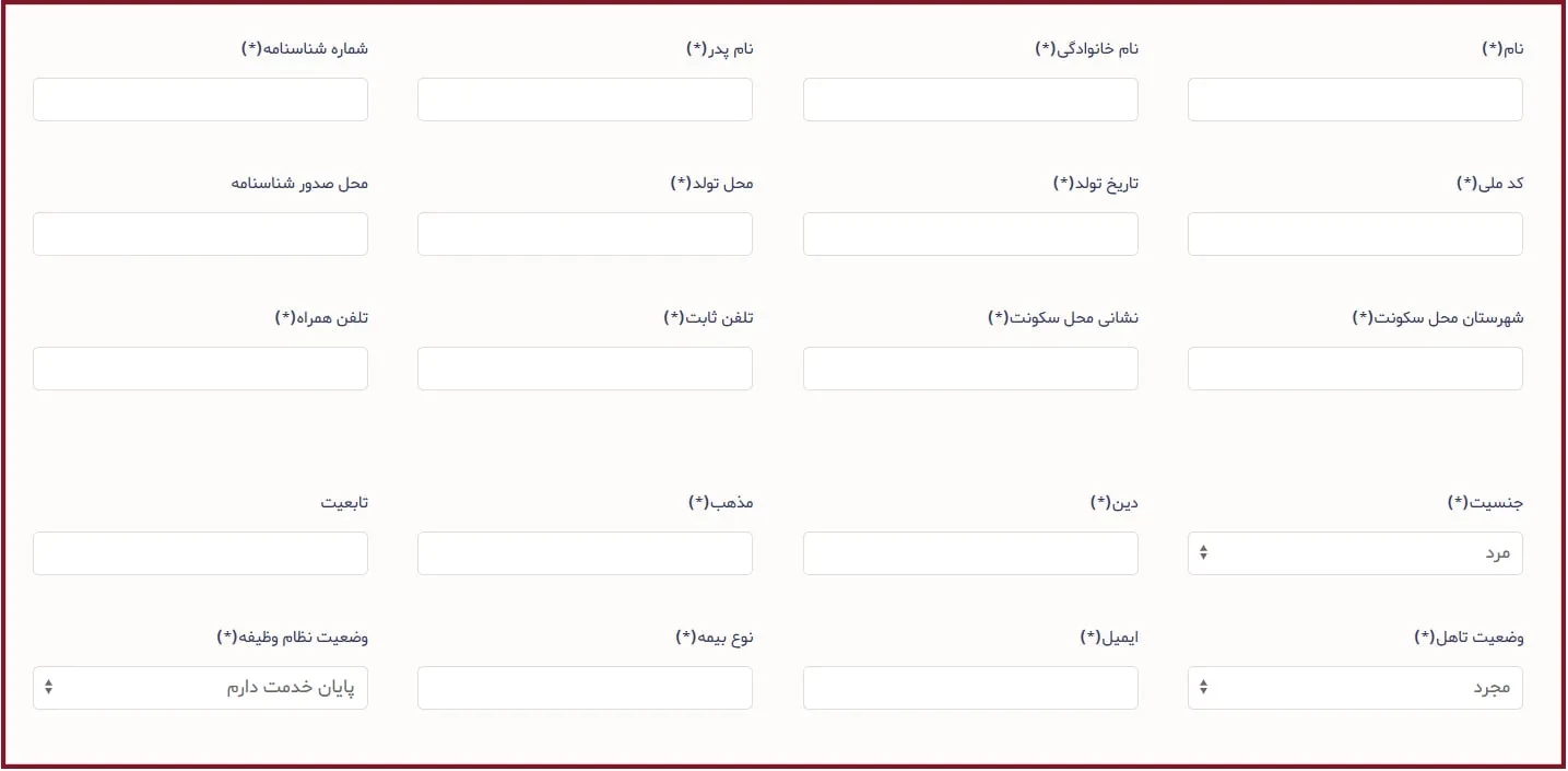 پس از کلیک روی گزینه همکاری با ما صفحهای مشابه تصویر زیر در قالب فرم دعوت به همکاری نمایش داده میشود. در این بخش،ابتدا باید اطلاعات هویتی خود شامل نام و نام خانوادگی، کد ملی، تاریخ تولد، آدرس محل سکونت و.. را وارد نمایید.