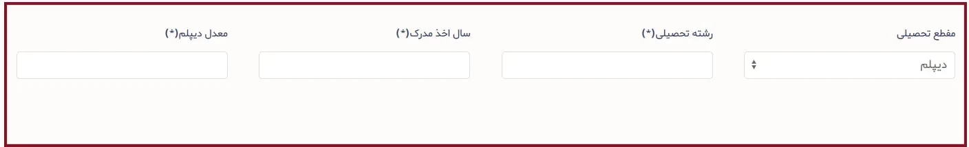 این بخش مربوط به سوابق تحصیلی شما است و باید اطلاعاتی نظیر مقطع تحصیلی، رشته تحصیلی، سال اخذ مدرک و معدل دیپلم را وارد نمایید.