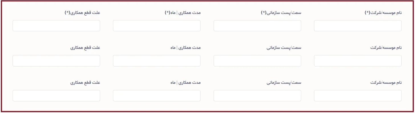 در این بخش اطلاعات مربوط به سوابق کاری خود از جمله نام موسسه، سمت سازمانی، مدت همکاری و.. را وارد نمایید.