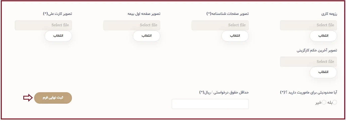 در این بخش، باید رزومه کاری، تصویر صفحات شناسنامه، تصویر کارت ملی و.. را در فیلد های مربوطه بارگذاری کنید و در نهایت روی دکمه "ثبت نهایی فرم" کلیک نمایید.