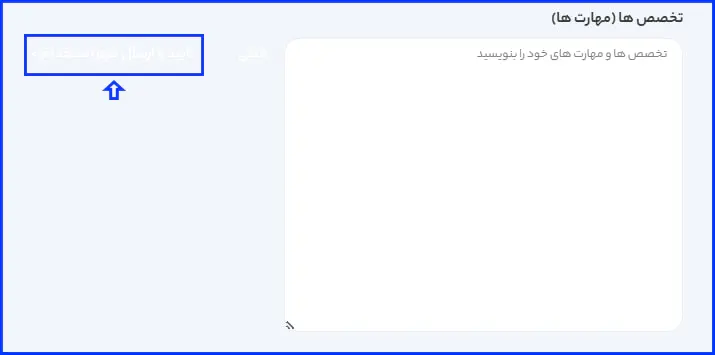 در این مرحله میتوانید مهارتها و تخصصهای خود را وارد کرده و سپس روی دکمه "تایید و ارسال فرم استخدام" کلیک نمایید.