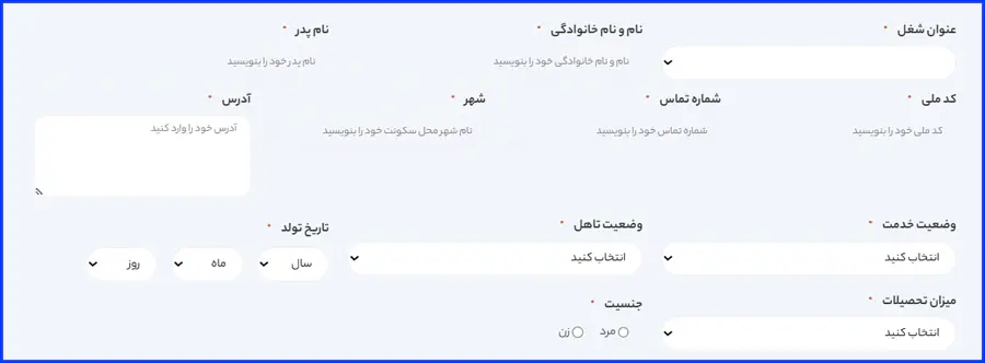 در این مرحله باید اطلاعات هویتی خود، شامل عنوان شغل مورد تقاضا، نام و نام خانوادگی، نام پدر و سایر موارد خواستهشده را وارد نمایید.