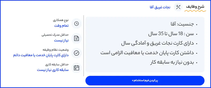 در این مرحله، پس از بررسی شرایط احراز و اطمینان از تطابق آنها با توانمندیهای خود، روی دکمه "پر کردن فرم استخدام" کلیک نمایید.