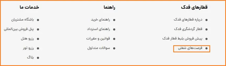 متقاضیان سایر فرصتهای شغلی در شرکت قطار فدک نیز میتوانند از طریق بخش «فرصتهای شغلی» در فوتر سایت، رزومه خود را ارسال کنند.