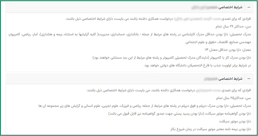 افرادی که برای تصدی سمت کارمند (متصدی امور بانکی) درخواست همکاری داشته باشند می بایست دارای شرایط اختصاصی ذیل باشند: