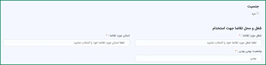 در این بخش، باید اطلاعاتی نظیر شغل مورد تقاضا، استان مورد نظر و وضعیت بومی خود را وارد نمایید.
