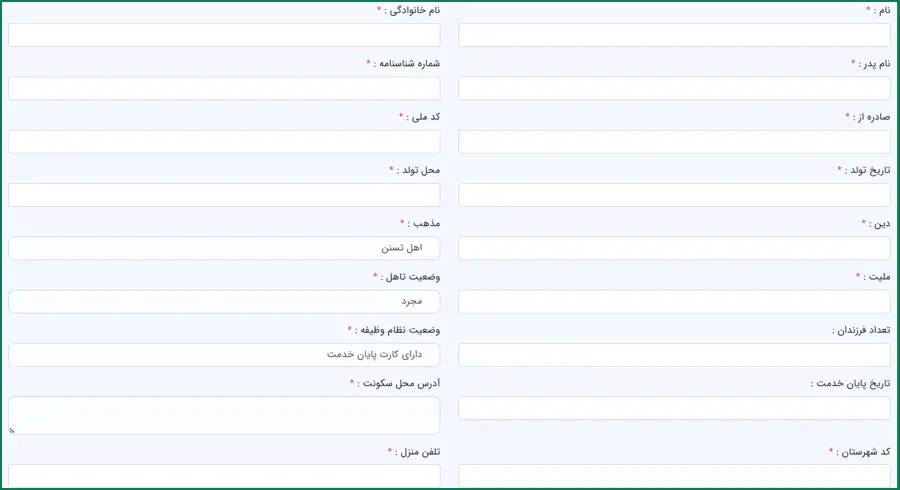 این بخش مربوط به اطلاعات هویتی شما است که باید در آن مواردی نظیر نام و نام خانوادگی، نام پدر، شماره شناسنامه و.. را وارد نمایید.
