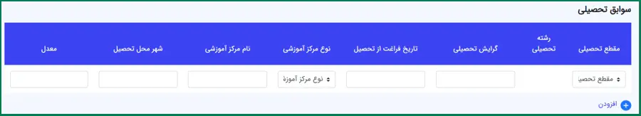 در این بخش، میتوانید اطلاعات سوابق تحصیلی خود شامل مقطع تحصیلی، رشته و گرایش تحصیلی، تاریخ فارغالتحصیلی و… را وارد نمایید.