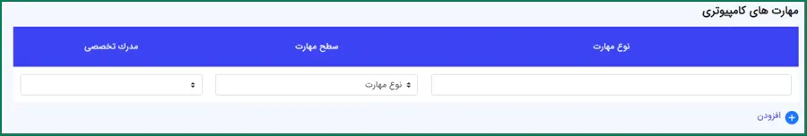 بخش چهارم مربوط به مهارتهای کامپیوتری است که میتوانید در آن مواردی نظیر نوع مهارت، سطح مهارت و مدرک تخصصی خود را وارد نمایید.