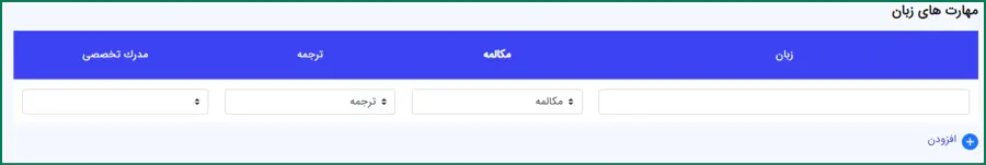 در این قسمت میتوانید مهارتهای زبانی خود شامل نام زبان و میزان تسلط در مکالمه، ترجمه و مدرک تخصصی را وارد نمایید.