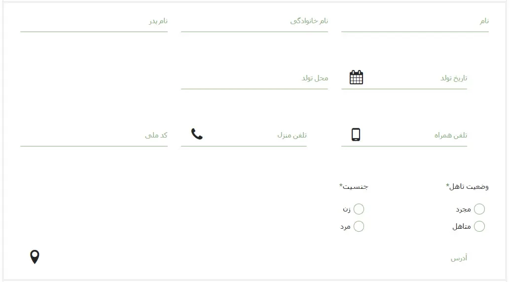 در این بخش، اطلاعات هویتی خود شامل نام و نام خانوادگی، نام پدر، تاریخ تولد، تلفن همراه، کدملی و.. وارد کنید.