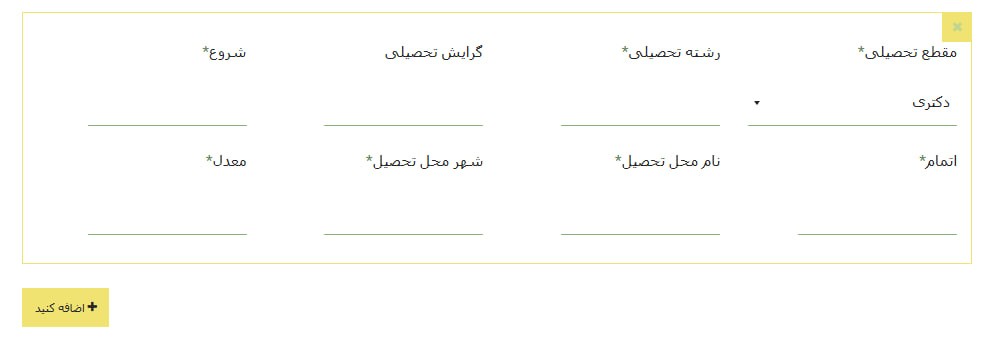در این بخش، باید مقطع تحصیلی، رشته و گرایش تحصیلی، وضعیت اتمام تحصیل، معدل و.. را وارد نمایید. در صورت داشتن اطلاعات اضافی، روی دکمه "اضافه کنید" کلیک کرده و اطلاعات خود را وارد نمایید.