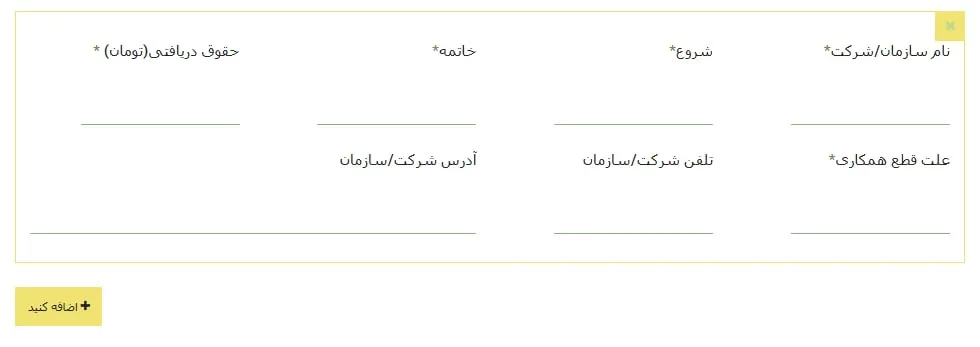 این بخش مربوط به شرکت یا سازمان قبلی که در آن مشغول به کار بودهاید میباشد که باید اطلاعاتی نظیر نام شرکت، تاریخ شروع و پایان کار، میزان حقوق دریافتی، علت قطع همکاری و.. را وارد نمایید.