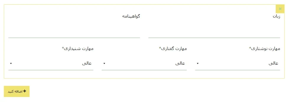 در این بخش، باید اطلاعات مربوط به مهارتهای زبانی خود از جمله نام زبان و گواهینامه دریافتشده را وارد کنید، سپس سطح میزان تسلط خود در مهارتهای نوشتاری، گفتاری و شنیداری را مشخص نمایید.