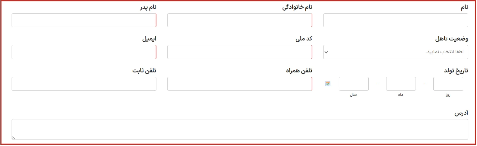 پس از کلیک روی گزینه فرم استخدام، صفحهای مشابه تصویر زیر نمایش داده میشود که در آن باید اطلاعات هویتی خود از جمله نام و نام خانوادگی، نام پدر، کد ملی و... را وارد نمایید. توجه داشته باشید فیلدهایی که کنار آنها نوار قرمز رنگ قرار دارد، الزامی است.